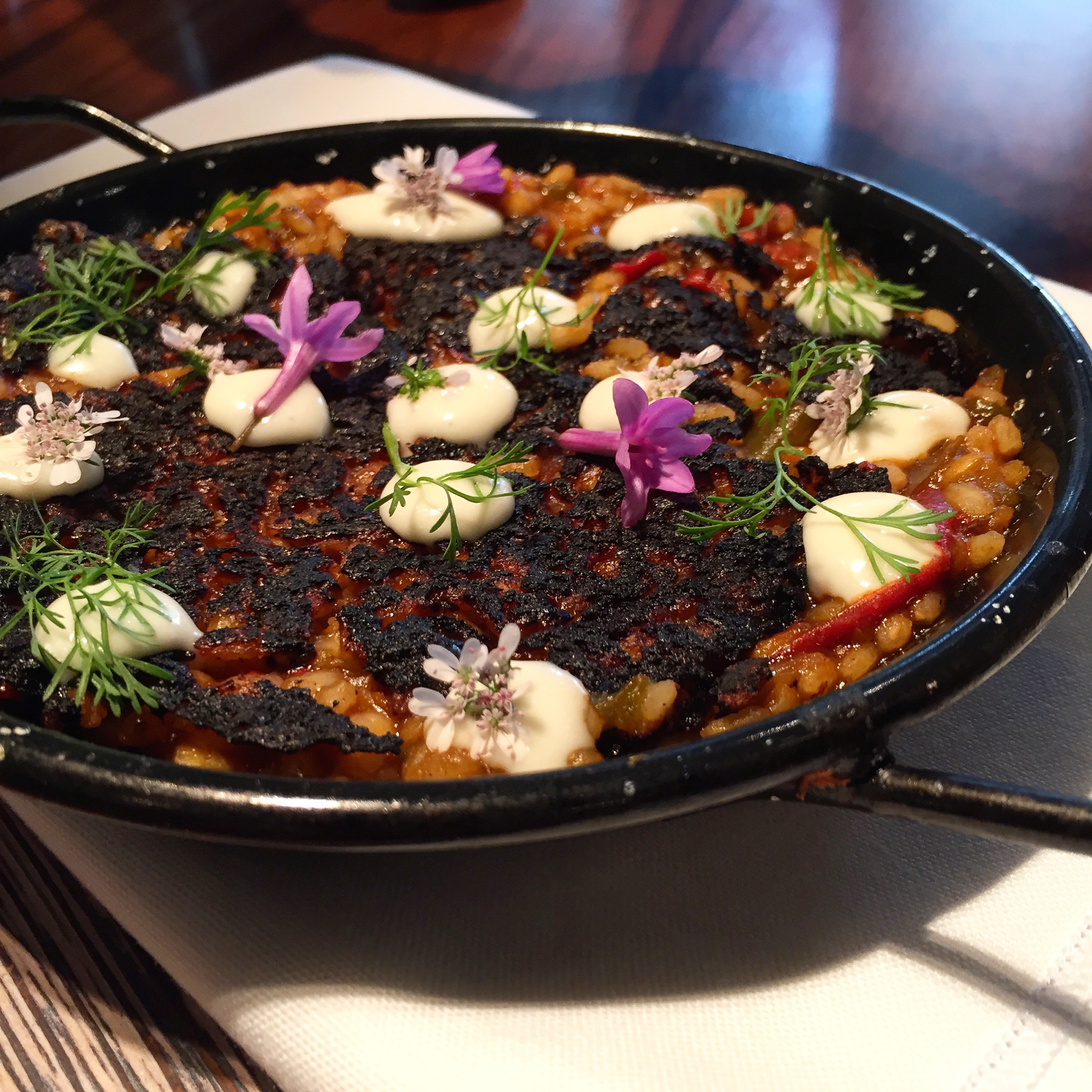 Arroz (con socarrat, como en Valencia, con bisque de camaron, escalibada de pimientos, chile morita, salsa molcajete y ali-oli)