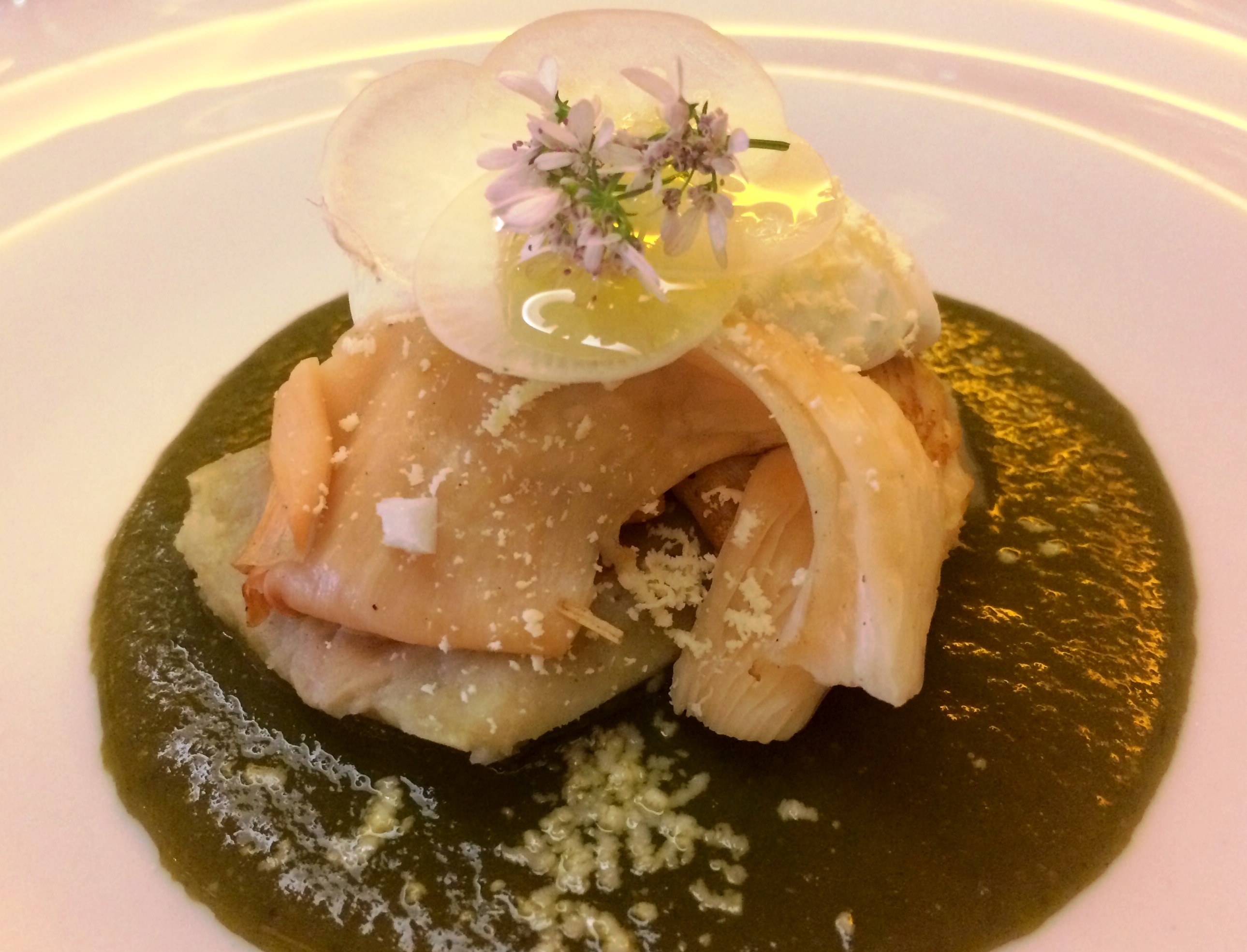Y damos paso a sus platos fuertes. Un tamal con seta rosa y un fondo de mole verde nos convence de que, en efecto, su mano para el guiso es impecable. Podría ser un tamal, un taco o un pescado, pero aquí el protagonista es ese molito que muestra una textura y acidez únicas.